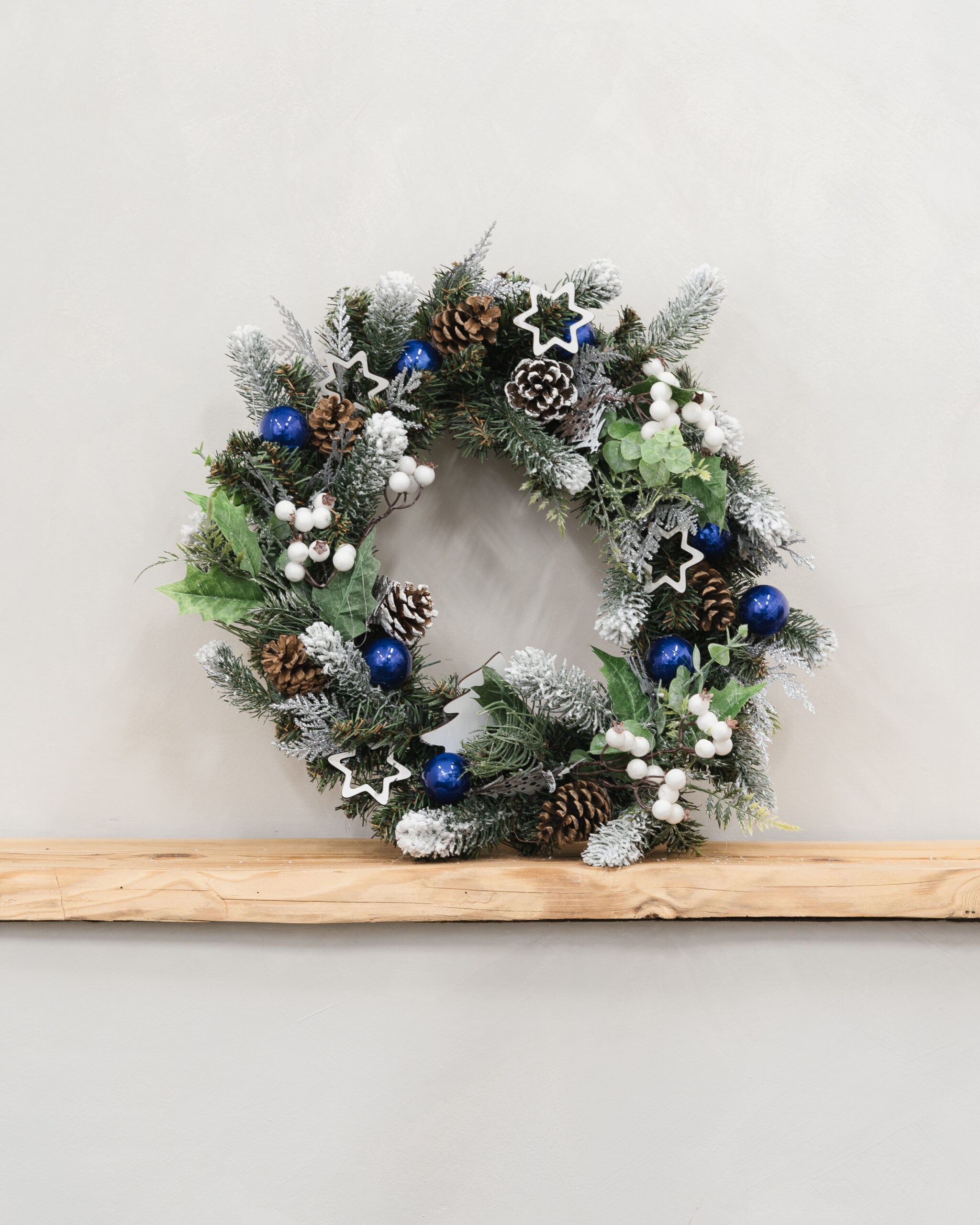 Jõulupärga kaunistavad erinevad elemendid nn – käbid, sinised ehted ning kangast riidetükid.