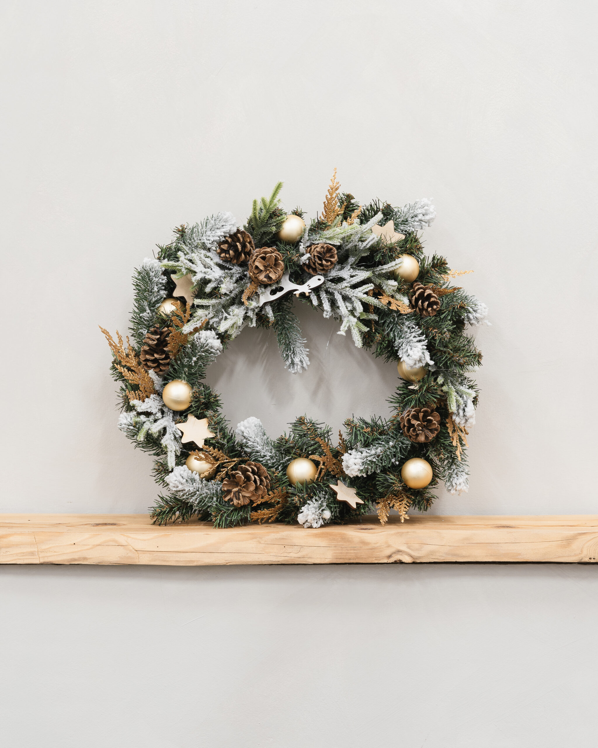 Jõulupärga kaunistavad erinevad elemendid nn – käbid, kuldsed ehted ning kangast riidetükid.