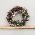 Jõulupärga kaunistavad erinevad elemendid nn – käbid, valged ehted ning kangast riidetükid.