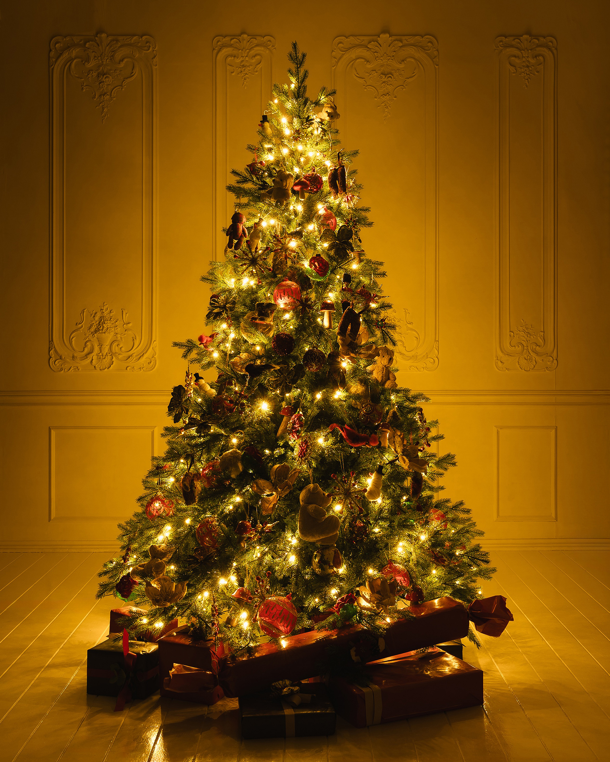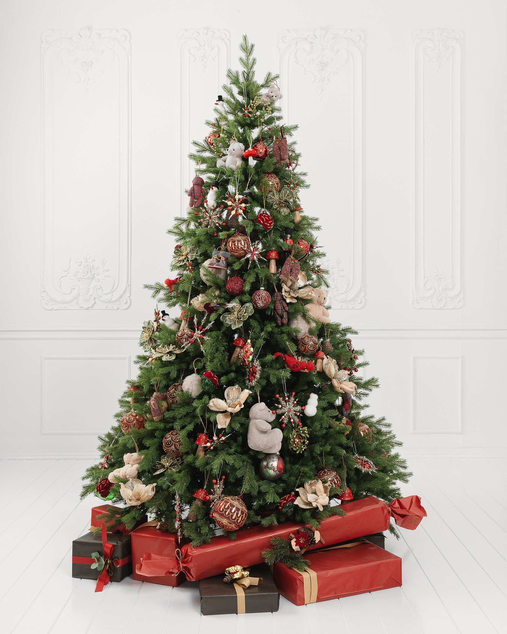 Ostettu tekokuusi ei sisällä koristeita, lahjapaketteja eikä punottua koria.