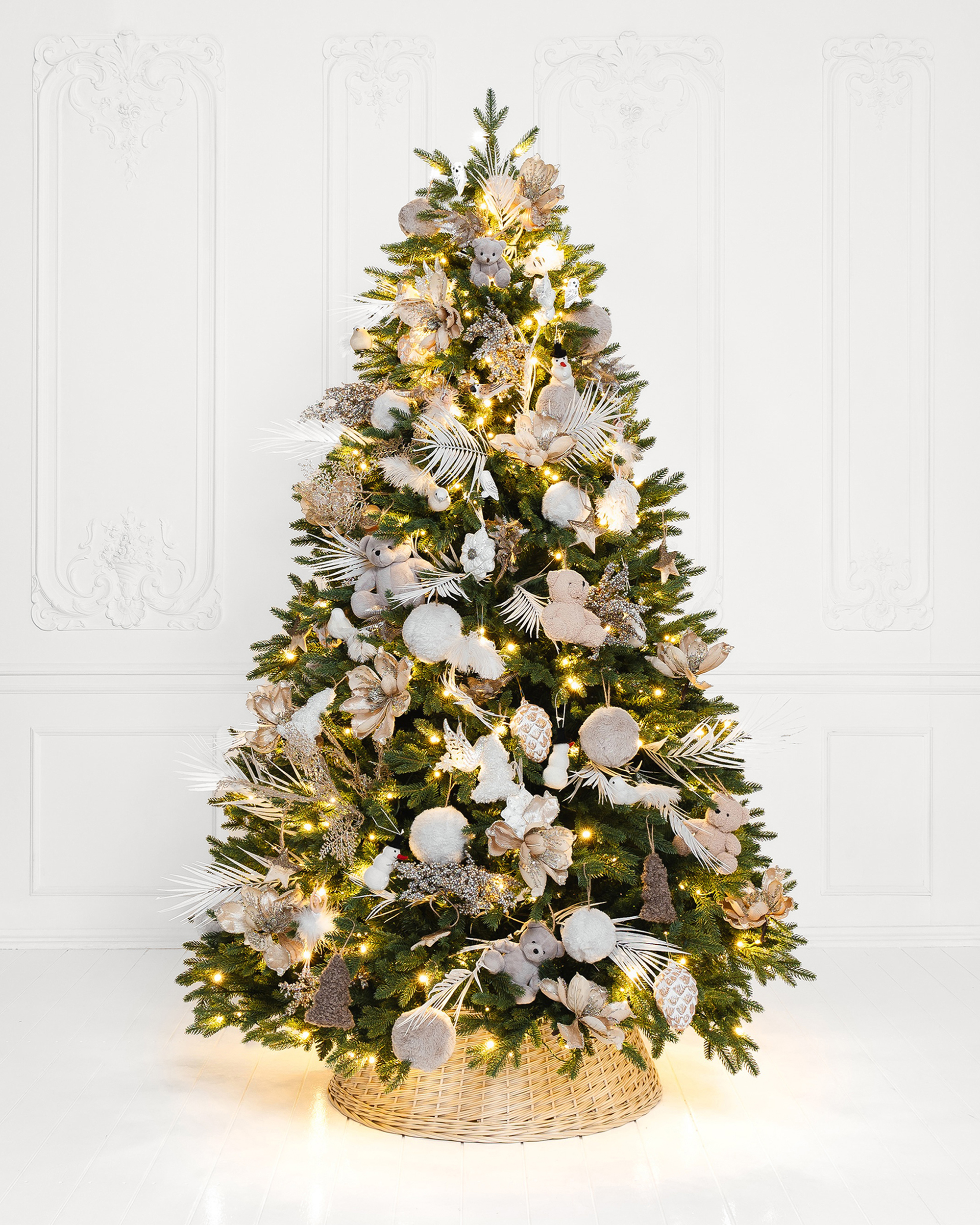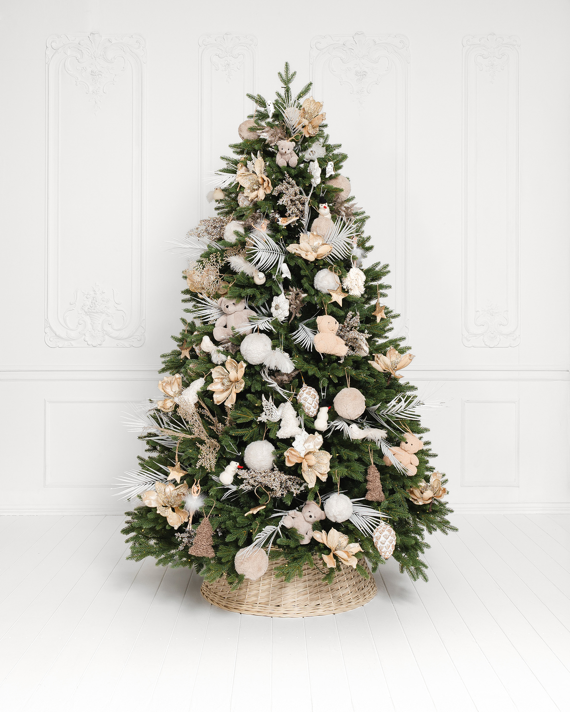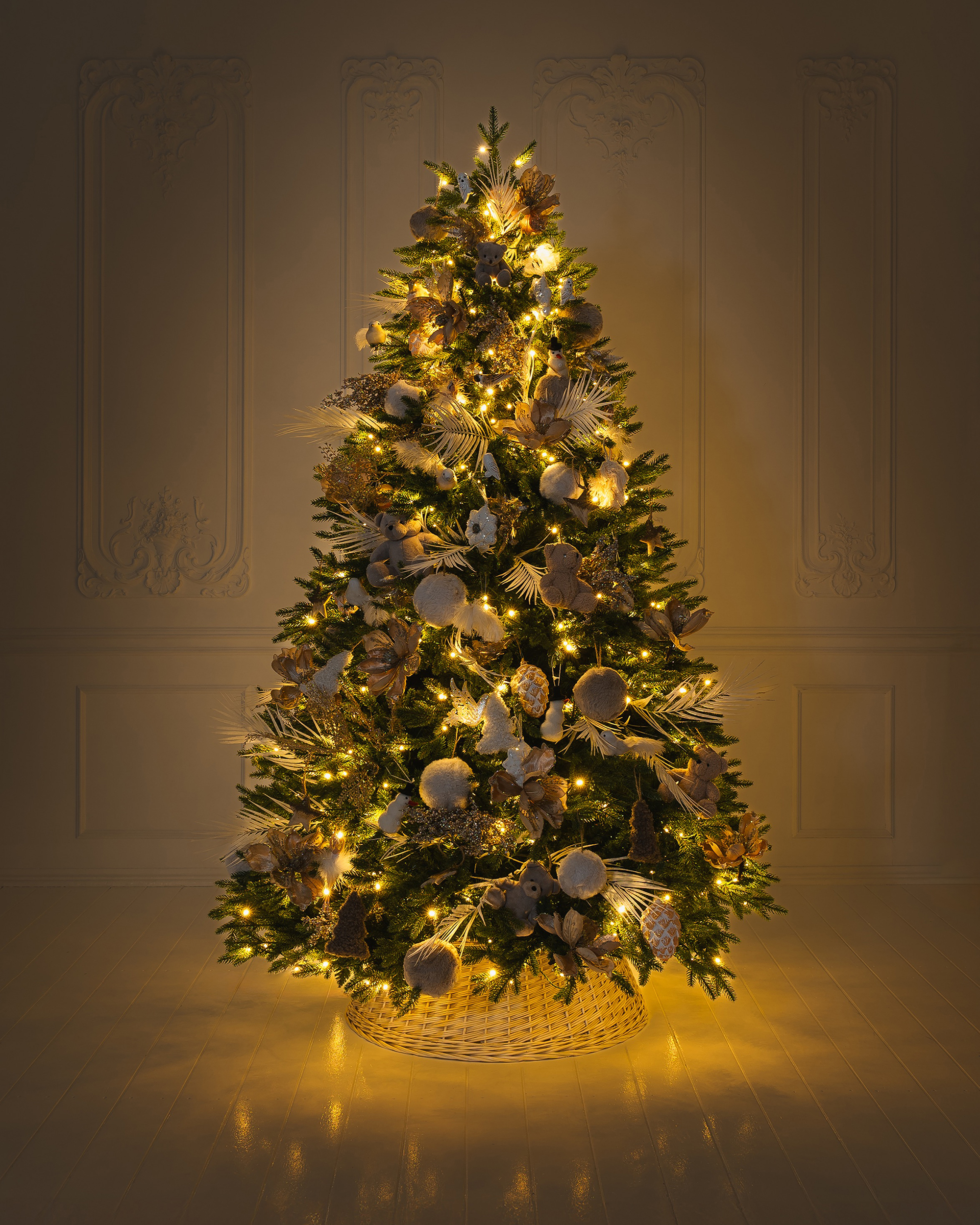 Ostettu tekokuusi ei sisällä koristeita, lahjapaketteja eikä punottua koria.